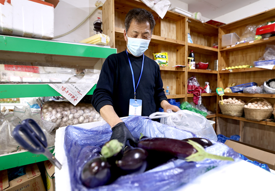 4月10日,上海超杰综合生鲜超市员工徐启银在恢复营业的店内为网上订单分装蔬菜。