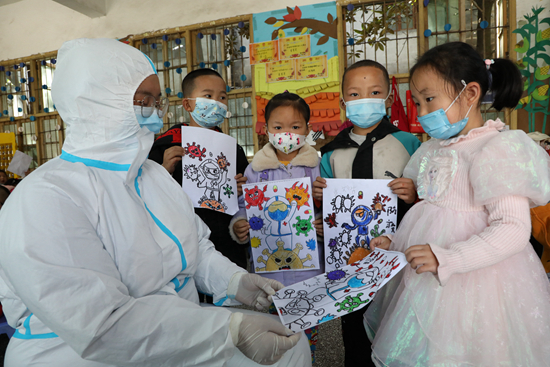 4月11日,湖南省保靖县,清水坪学校幼儿园小朋友给采集核酸的医护人员送自制防疫贺卡。连日来,医护人员来到该校给1000多名师生做核酸检测采样,为师生的健康保驾护航。同学们用自制贺卡等方式,表达对医护人员的感谢。 俞采华/人民视觉