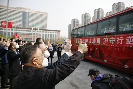 4月11日,天津,“人民英雄”国家荣誉称号获得者、中国工程院院士张伯礼(前)等为出征的中医医生送行。