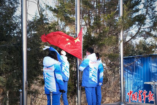 大年初一当天,北京冬奥会延庆赛区志愿者驻地举行升国旗仪式。 中青报·中青网见习记者 尹希宁/摄