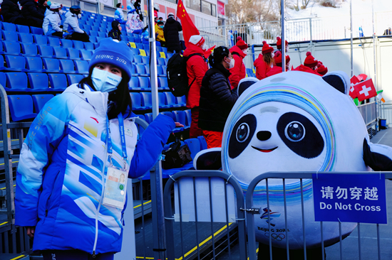 北京冬奥会志愿者徐天然在国家高山滑雪中心看台区与冰墩墩合影。 北京化工大学供图