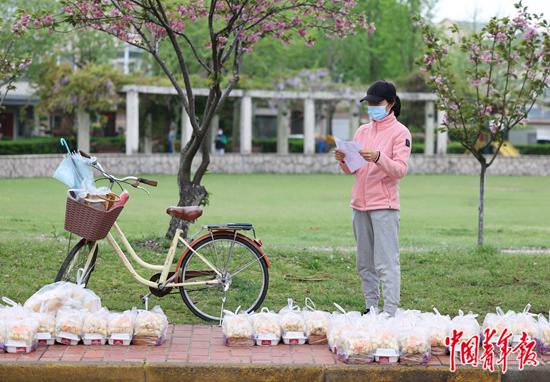 4月14日,上海市浦东新区,一名负责社区团购的“团长”正在查看当日的团购清单,她的面前摆着到货的豆制品,身后是盛开的樱花。 中青报·中青网记者 李强/摄