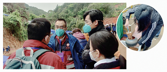 左:3月27日,尹平(左二)在坠机现场和心理救援专家组成员共同商讨相关工作。