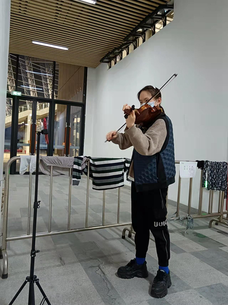 上海静安体育中心方舱内,一个女孩在拉小提琴。