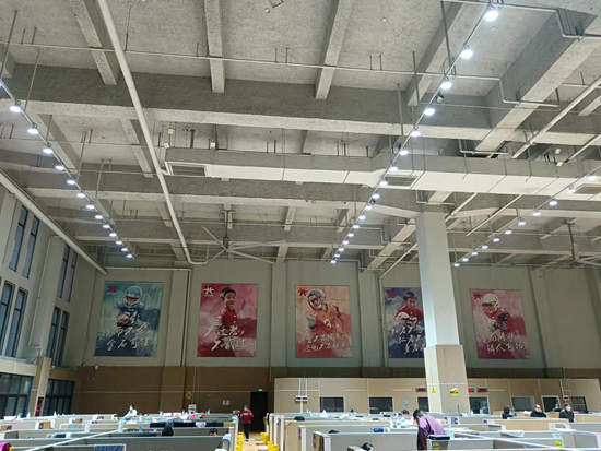 上海静安体育中心方舱,悬挂的巨大海报。 (本版图片均由受访者提供)