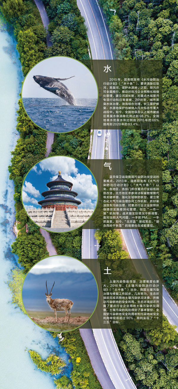 2013-2020年,首批实施新空气质量标准的74个城市PM2.5浓度下降48.6%,优良天数比率上升17.9个百分点,重污染天数下降八成以上。尽管离美丽中国的目标还有距离,新一轮污染攻坚依然没有放松力度,将以更高标准保卫蓝天、碧水和净土,推动生态环境质量改善由量变到质变。