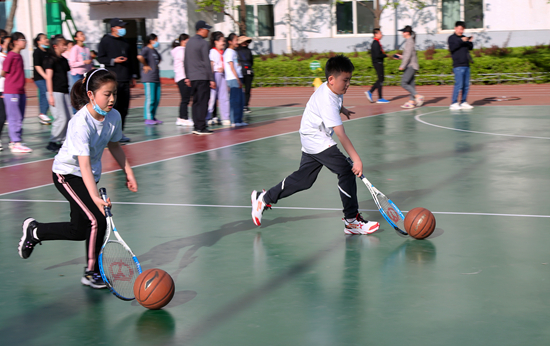 4月22日下午,北京怀柔第三小学学生参加“羊角球、赶猪、呼啦圈”等项目的趣味运动。视觉中国供图