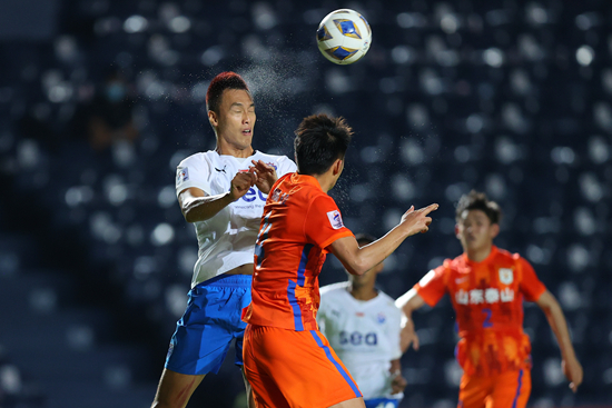 2022亚冠小组赛,狮城水手3∶2战胜山东泰山,图为18岁小将杨瑞琪(右)与金信煜争顶。视觉中国供图