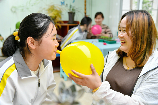 2021年5月13日,浙江省湖州市长兴县夹浦镇中学,初三学生正在进行“梦想气球”亲子趣味减压活动。当孩子带着负面情绪回到家的时候,需要的是被家长拥抱和允许,并提供帮助。视觉中国供图