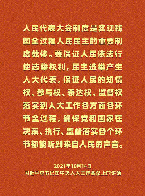 2021年3月,十三届全国人大四次会议通过了关于修改全国人大组织法的决定,第一次将习近平总书记关于全过程人民民主的重要理念写入法律,规定了全国人大及其常委会“坚持全过程民主”,全国人大代表“充分发挥在全过程民主中的作用”,从国家立法层面为发展全过程人民民主提供了法治支撑,让人民当家作主在国家政治生活和社会生活中得到更加广泛真实的体现。