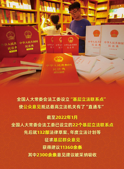 让“高大上”的立法“接地气”,像昆山这样的基层立法联系点,是全国22个基层立法联系点积极开展工作的一个缩影。截至2022年1月,全国人大常委会法工委设立的22个基层立法联系点先后就132部法律草案、年度立法计划等征求基层群众意见,获得建议11360余条,其中2300余条意见建议被不同程度采纳吸收,生动践行、发展着新时代全过程人民民主。