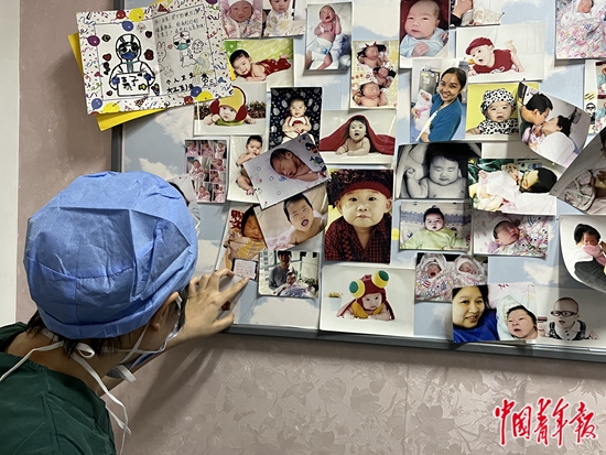 东城区妇幼保健院,产房护士长站在新生儿照片墙旁。郭玉洁/摄
