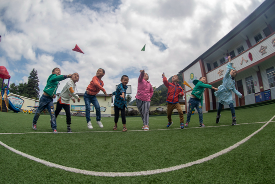 2019年9月2日,位于重庆南川金佛山东麓的大有镇石良小学校迎来新学期的第一天,一年级新生放飞手工课作业纸飞机。视觉中国供图(资料图片)