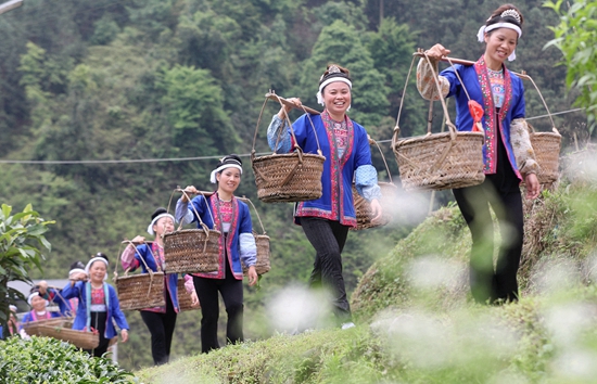 4月28日,广西柳州,在三江侗族自治县良口乡寨塘村,妇女们在挑运小土豆。当日,该村举行第二届“庆祝丰收、振兴乡村”小土豆推广活动。龚普康/视觉中国