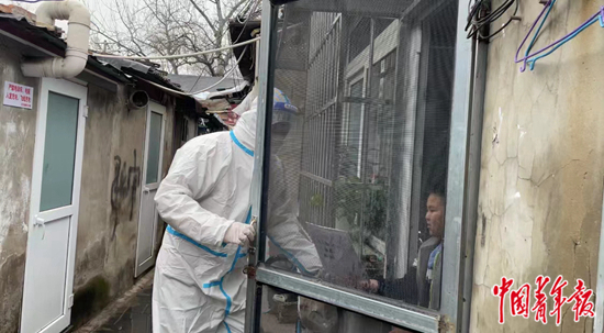 3月29日,北京市东城区一封控区内,防控工作人员给隔离在家的小学生送去打印材料。中青报·中青网记者 刘昶荣/摄