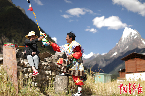 2020年8月25日,西藏林芝市工布江达县错高村,平措(右)表演完当地的非物质文化遗产“梗舞”准备回家,他的妻子接过演出服的帽子。错高村是林芝市唯一一个保护完整的古村落,2019年该村57户农牧民搬迁至新村,计划通过旅游产业改善生活。中青报·中青网记者 李隽辉/摄