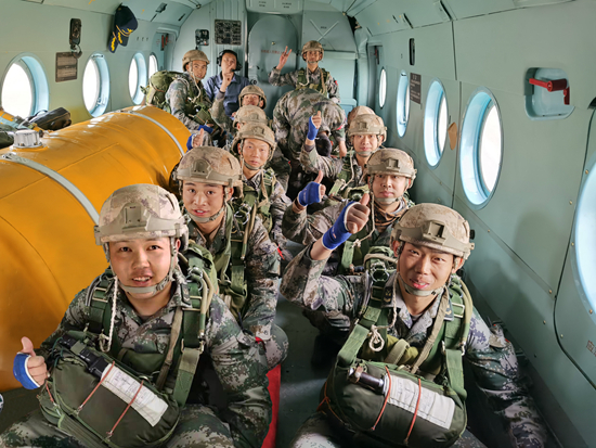 飞机的轰鸣和突然的盘旋拉升让炊事班战士郑子煜有点心跳加速。“上天犹如雄鹰翱翔,入地犹如猛虎出山,下水胜似强龙翻江,骁勇善战……”看见有的战友面露紧张,班长侯家如带头唱起了旅歌《特战豪情》,嘹亮的歌声带动了大家的情绪,让战士们的紧张心情稍有缓解。