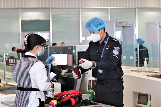 记者了解到,在上岗前,这些安检人员对工作服进行全面细致的岗前消毒,上岗时配备N95口罩、一次性丁腈手套、防护面罩和一次性医用帽,确保为广大旅客提供安全、健康的过检环境。