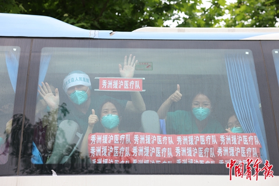 5月15日,上海市闵行区,浙江省秀洲援护医疗队等待返程。当天下午,1800名浙江省援沪核酸采样队队员返回浙江。他们从3月底开始支援上海,累计出动近10万人次,完成核酸采样4000余万人次。