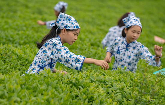 4月27日,江西省新余市高新三小的小学生在当地茶场建立的茶文化劳动基地体验采茶。 视觉中国供图
