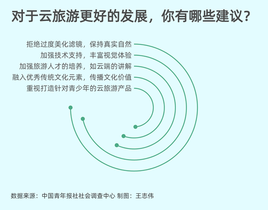推动云旅游更好地发展,受访者的建议还有:加强旅游人才的培养,如云端的讲解(49.5%),融入优秀传统文化元素,传播文化价值(48.4%),重视打造针对青少年的云旅游产品(42.5%),打造周边文化产品,拓宽云旅游的范围(31.3%),挖掘和整合旅游资源,提供更多选择(29.8%),完善相关服务,保证用户体验(25.4%)等。
