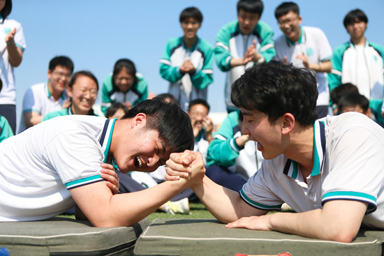 5月22日,青岛通济实验学校高三学生在进行掰手腕比赛。