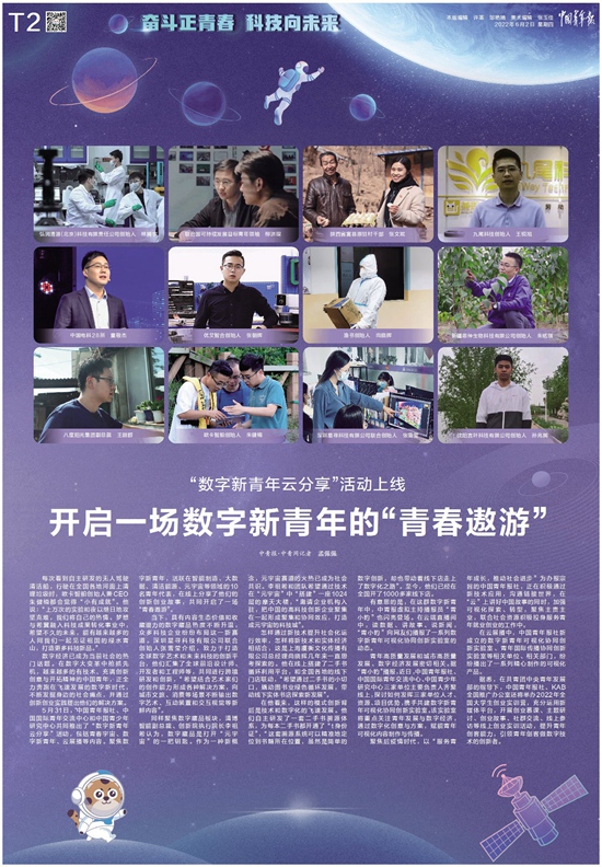 5月31日,中国青年报社、中国国际青年交流中心和中国青少年研究中心共同推出了“数字新青年云分享”活动,包括青春宇宙、数字新青年、云展播等内容。聚焦数字新青年,活跃在智能制造、大数据、清洁能源、元宇宙等领域的10名青年代表,在线上分享了他们的创新创业故事,共同开启了一场“青春遨游”。