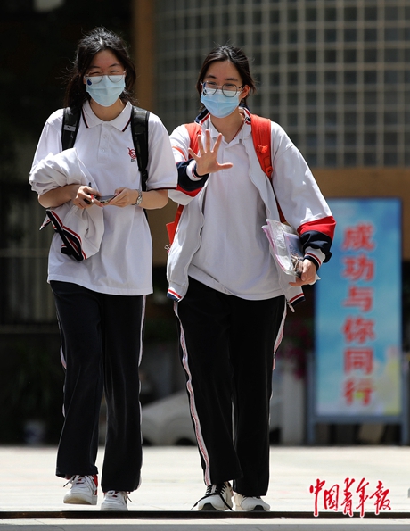 6月8日,北京市朝阳区陈经纶中学考点外,语文考试结束后,两名考生走出考场。中青报·中青网记者 陈剑/摄