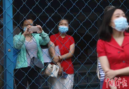 6月7日,北京市朝阳区陈经纶中学考点外,家长隔着防护网拍照。中青报·中青网记者 陈剑/摄