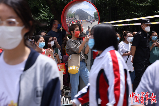 6月7日,北京市第一七一中学考点外,2022年高考第一场语文考试结束后,家长们在考场外迎接考生出场。中青报·中青网记者 曲俊燕/摄