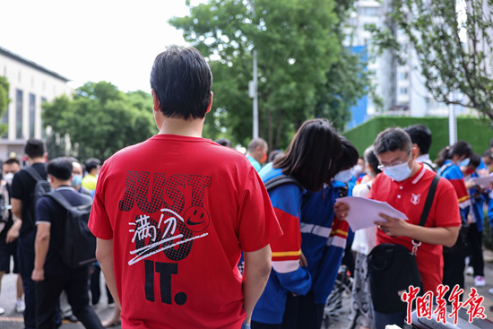 家长和送考老师们穿着印有“高考加油”“金榜题名”等字样的文化衫,或是红色系的旗袍、长裙,为考生“应援”。他们关切的目光隐藏在手机屏幕后,时刻聚焦在走入或走出考场的学生们身上。