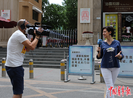 6月8日,北京市朝阳区陈经纶中学考点外,外国记者在做现场报道。中青报·中青网记者 陈剑/摄