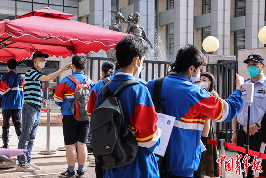 6月7日,北京市东直门中学考点外,2022年高考第一天,考生们入场前接受体温检测,考场门口设置了自动测温仪和人工测温。中青报·中青网记者 曲俊燕/摄