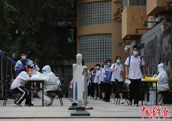 6月8日下午4点半,北京市朝阳区陈经纶中学考点,高考第二天的考试结束后,考生们收拾好文具和随身物品陆续离开考场。他们没有直接走向校门外等待已久的家长,而是在学校大门附近排队做完核酸检测后才离开。据了解,今年高考期间,按照北京教育考试院安排,6月7日、8日下午考试结束后,由考点统一组织考生进行核酸检测,确保考生满足考试防疫相关要求。