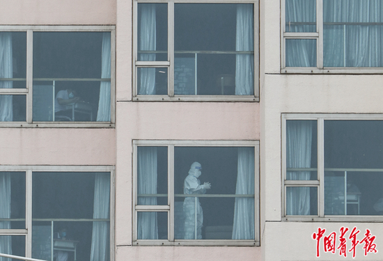 记者透过酒店窗户看到,这里8至10层的客房“变身”为高考考场,监考老师们早早就穿着统一的防护服在房间里严阵以待。考生坐在专门从学校运来的课桌椅上答卷,为的是更容易找到考场的“感觉”。