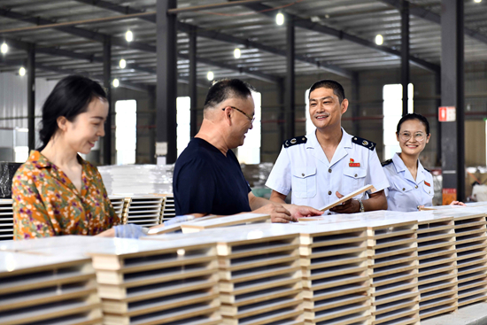 2021年6月16日,菏泽金然木制品有限公司,山东省菏泽市曹县税务局的工作人员上门走访,介绍出口退税相关优惠政策。新华社记者 郭绪雷/摄