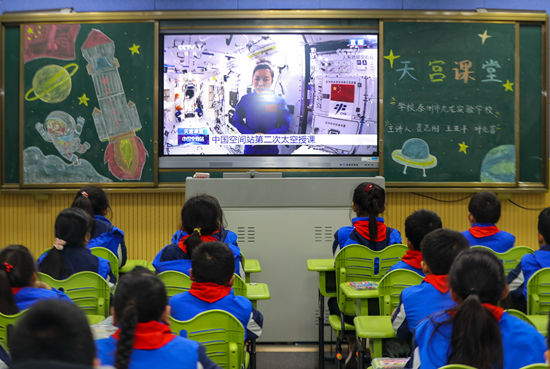 2022年3月23日,江苏省泰州市海陵区九龙实验学校学生收看“天宫课堂”第二课。 视觉中国供图