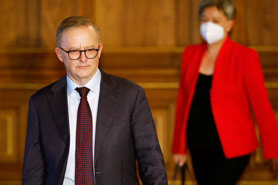 5月24日,日本东京,澳大利亚新任总理阿尔巴尼斯与新任外长黄英贤(后)准备与日本首相岸田文雄举行会谈。此前一天的5月23日,阿尔巴尼斯就任总理当天抵达日本,参加美日印澳“四方安全对话”峰会。人民视觉供图