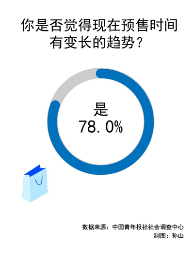 近日,中国青年报社社会调查中心联合问卷网(wenjuan.com),对1507名受访者进行的一项调查显示,78.0%的受访者觉得现在商品预售时间有变长的趋势,79.6%的受访者表示,超长预售会降低自己的购物体验。