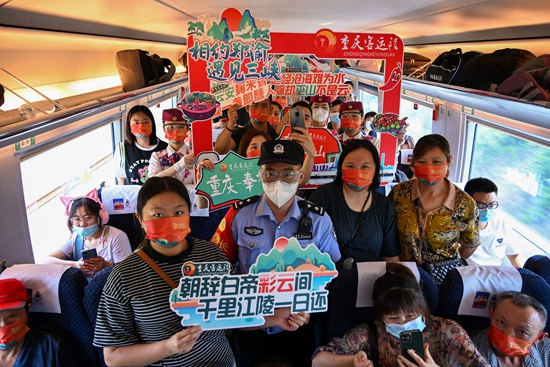 6月20日,巫山站开往重庆北站的C6407次列车上,旅客打卡留念。当日,郑州至重庆高速铁路襄阳东至万州北段开通,郑渝高铁实现全线贯通运营。郑渝高铁北起河南省郑州市,南至重庆市,途经河南、湖北、重庆3省市,全长1068公里,是我国“八纵八横”高速铁路主通道的重要组成部分。包亮/摄