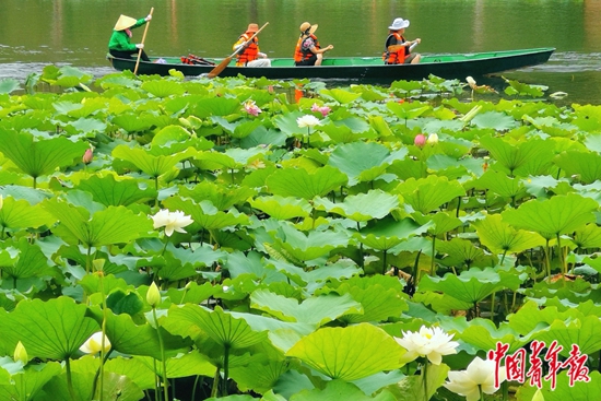 2019年7月,云南省文山州普者黑景区,游客在湖中游船。 中青报·中青网记者 陈鼎/摄