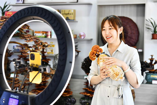 7月9日,在山东省聊城市冠县店子镇,主播在进行灵芝直播带货。