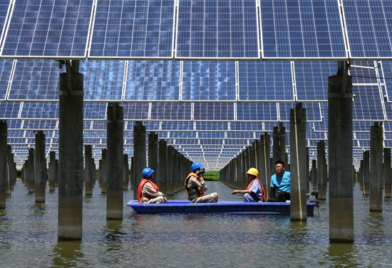 该光伏电站总装机容量80兆瓦,建设在约3000亩的鱼塘上,让鱼塘形成了“水上发电、水下养鱼”的绿色生态养殖模式,极大提高单位面积土地的经济价值。每年还以土地流转的方式让村民增收,进一步助力乡村振兴。新华社记者 孙凡越/摄
