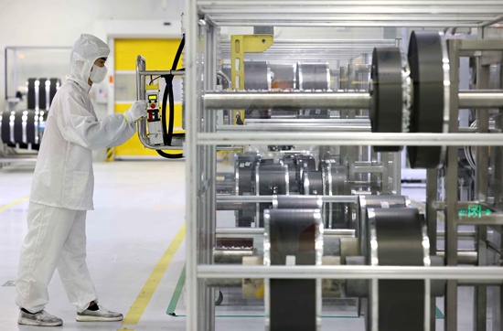 7月17日,在合肥一家动力电池生产企业的生产车间,技术人员在锂电池生产线上作业。解琛/摄(新华社发)