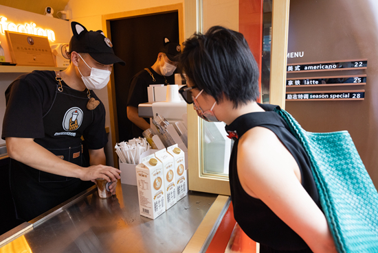 7月16日,殷天保(左)给顾客递出制作好的咖啡。当天,视障兄弟殷天保和殷天佑的咖啡馆在上海浦东一处商业广场试营业。两兄弟在朋友的帮助下,经过长时间刻苦训练,成为盲人咖啡师。咖啡馆内是为盲人量身定制的操作空间和机器,他们可以依靠触觉方便地操作。新华社记者 金立旺/摄