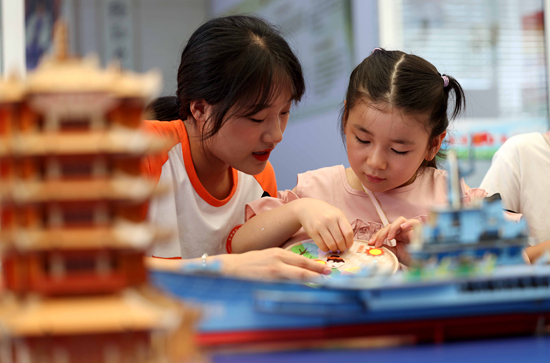7月6日,在安徽省合肥市凤阳一村社区新时代文明实践站,大学生志愿者教小朋友做手工。