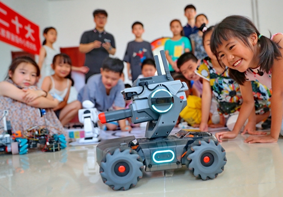 7月19日,河北秦皇岛,海港区白塔岭街道秦皇半岛第二社区内,小朋友正在观看“机甲机器人表演”。当日,该社区邀请辖区科普教师走进社区活动室。曹建雄/视觉中国