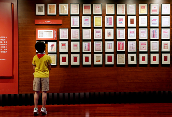 7月19日,一名小学生在中共二大会址纪念馆党章专题展厅内参观。暑假期间,许多中小学生来到位于上海市静安区的中共二大会址纪念馆,参观红色旧址,学习红色历史。新华社记者 刘颖/摄