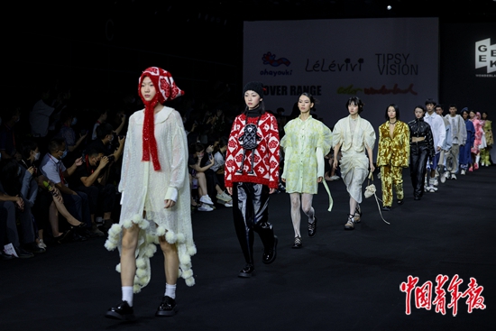 7月27日,海南海口,第二届中国国际消费品博览会国际时装周上,4个年轻设计师品牌的走秀现场。作为第二届消博会的重要活动之一,本次时装周不仅有时装发布会,还包含订货会、展馆快闪秀、品牌分享沙龙、时尚艺术展、投资接洽会、直播带货、时尚论坛、合作签约仪式等活动。 中青报·中青网记者 曲俊燕/摄