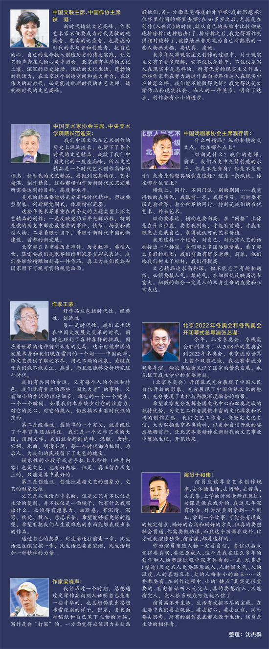 希望北京充分发挥全国文化中心和双奥之城的独特优势,为文艺工作者提供丰富的文化源泉和不竭的创作灵感。我们文艺工作者,将坚定文化自信,大力弘扬北京冬奥精神,以更加自信开放的姿态砥砺前行,让北京冬奥精神在新时代的文艺事业中落地生根、开花结果。